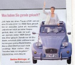 Erdnussflips... und Spüli...). Frau Bettina Böttinger kaufte sich einen 2CV, den sie sich immer gewünscht hatte. Gratuliere!! Besser als Krokotasche und Pelzmäntel! Ich lade Frau Böttinger herzlich ein als