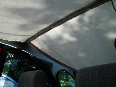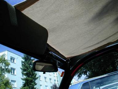 Bei den Fahrversuchen hat sich gezeigt, daß Geschwindigkeiten über 90 km/h nicht mehr schön sind, also müssen wir uns in Zurückhaltung üben. Es flattert dann schon bedenklich, bei 100km/h sind mir dann die hinteren Druckknöpfe aufgegangen, die werde ich noch umkonstruieren. Allgemein läßt sich sagen: Die Windlast liegt auf dem hinteren Teil, der Schatten ist ausreichend, die Luft bewegt sich im Inneren sanft, sehr angenehm, auch wenn das Cabriofeeling verlohren geht, denke ich es ist besser als verbrannt nach einer Lage beim Schlafen zu suchen. |