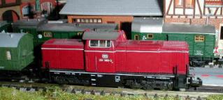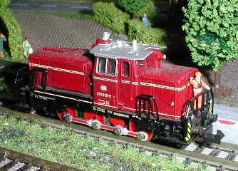 Diesel-Rangierlok von heute. Mit Personal drauf, von Trix.